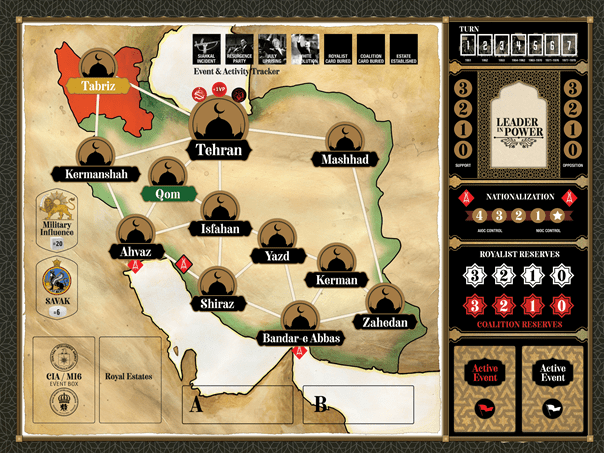 Dan: Most games on the subject of Iran are about attacking it. I wanted to make a game about Iran with Iranians in the foreground. The conflict isn’t portrayed through the lens of superpowers. The biggest difference is scope. Something like Twilight Struggle has Soviet and US influence. That influence needs to be monolithic for a game covering every continent except Antarctica (see Erin Lee Escobedo’s Meltwater for that). To portray influence in Iran, the design needs more types of influence to show sectarian clashes and more fluidity in how these influences align. For example, in 1979 the military influence will always back the shah, but ulama (clergy) and bazaari (merchant class) influence will migrate from one side to the other as the game progresses.