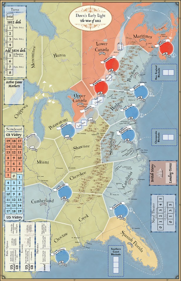 David: The War of 1812, from the Canadian theater to the Indian frontier to the naval war. This game recreates the entire conflict and lets players fight it out on land, sea, and in the arena of politics and public sentiment. You win by amassing victory points across 8 turns covering the years 1812 to 1814, or you can win instantly by getting 20 VP’s or with a conquest knockout by conquering a set of your opponent’s key cities.