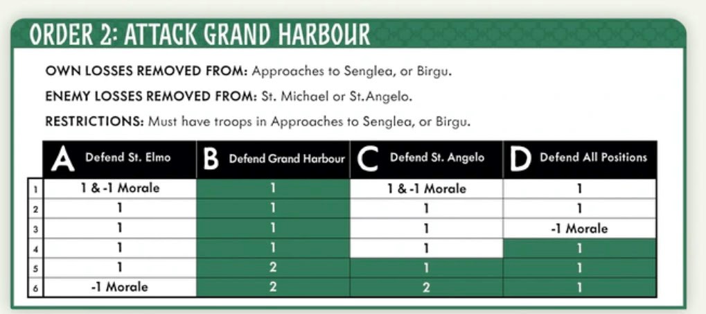 So, if, for example you’re the Turks and you choose order 2: Attack Grand Harbour you will probably cause serious damage to the Knights if they are concentrating on Defending St. Elmo (column A). However, if they are focusing on defending Grand Harbour all the news is going to be bad for you.