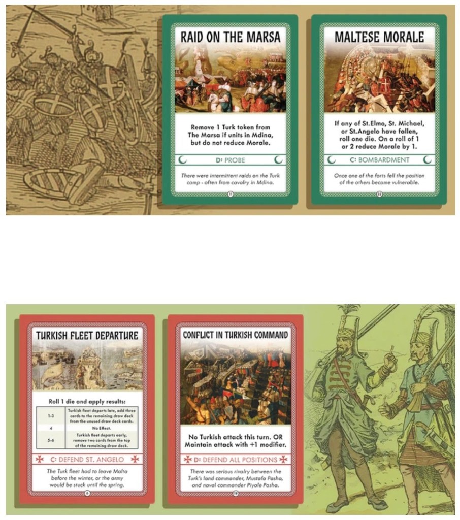Events are things that happened in the siege and capture some of the narrative flavor of the campaign – things like raids, desertion, decapitated heads being used as cannonballs, water being poisoned, mutinies, conflict inside the Turk command structure, snipers, sentries missing from their posts, and the death of Dragut.