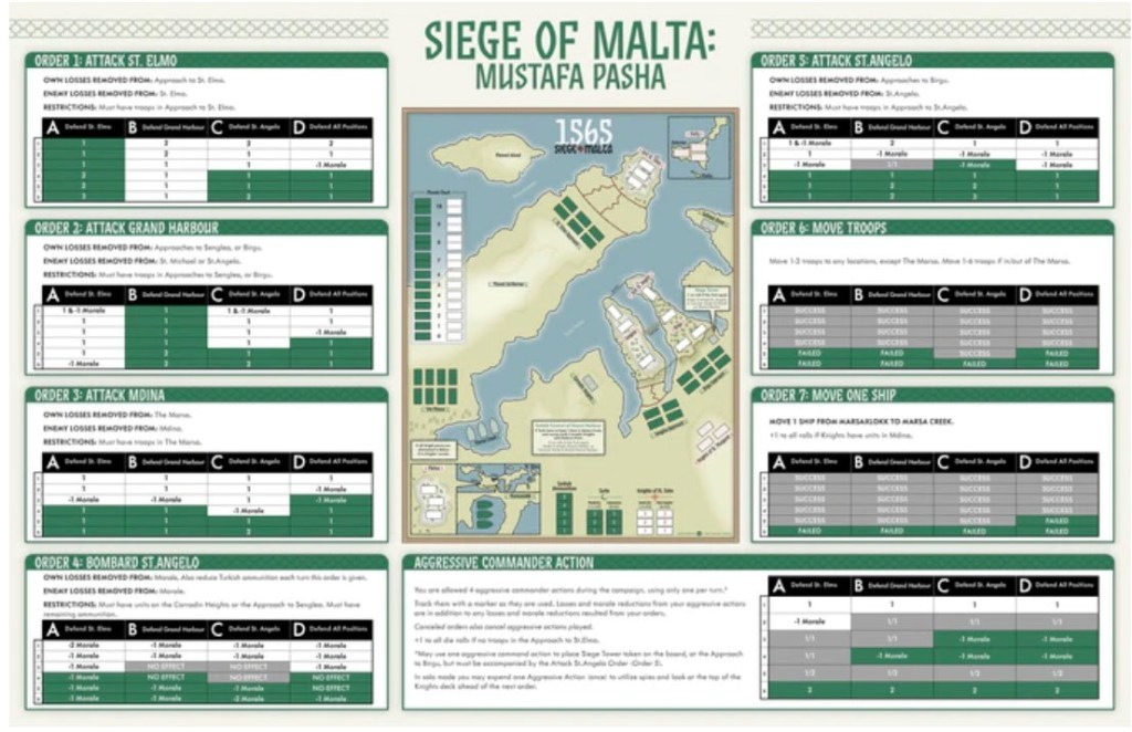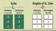 Malta also has some limited ‘resources’, logged on tracks on the board, keeping track of Turk ammunition, and of various re-roll and modifier abilities.