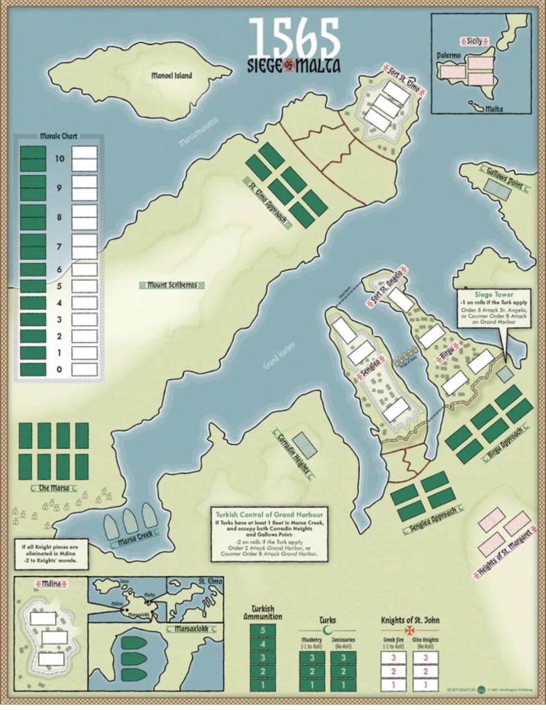 We became acquainted with Maurice Suckling with his game Freeman’s Farm 1777 from Worthington Publishing in 2019 and really enjoyed the mechanics of that game and how they all came together to create an interactive and interesting look at the Battle of Saratoga in the American Revolution. Since that time, Maurice has designed several games that have went onto successful Kickstarter campaigns including Hidden Strike: American Revolution and Chancellorsville 1863. He is back at it again with a new game in the Great Sieges Series from Worthington Publishing called 1565 Siege of Malta.