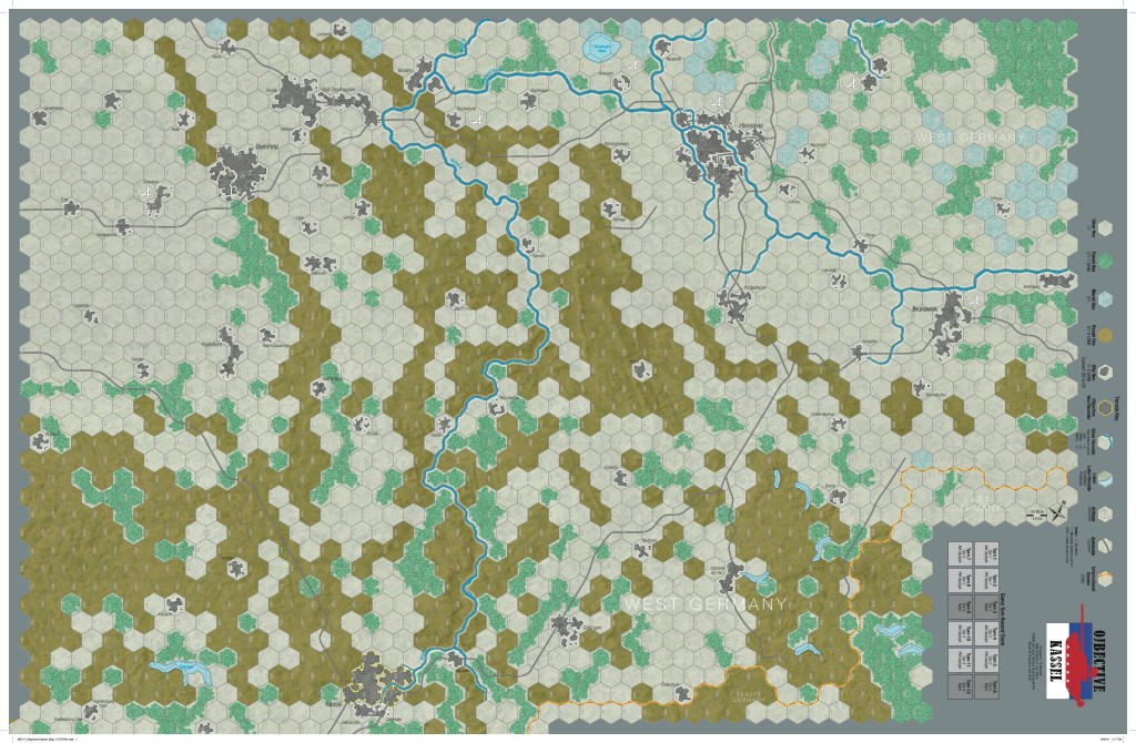 Ty: Objective Kassel corresponds to the volume in the old-SPI Central Front Series titled BAOR which stands for “British Army of the Rhine.” So, in it, the action is centered on that small(ish) but elite army as it attempts to hold the attacking Soviets advancing toward the Rhine/Ruhr on a northerly axis. The Belgians also make their appearance as the major NATO reinforcement component on this map.