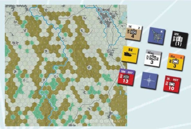 Ty: Across all five games, the map scale is 2.5 miles (4 km) per hex, with NATO units of maneuver modeled almost exclusively as battalions and Soviet/Pact units as regiments. Each day is divided into one night and two daylight turns.
