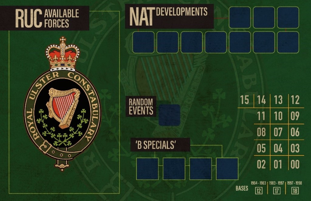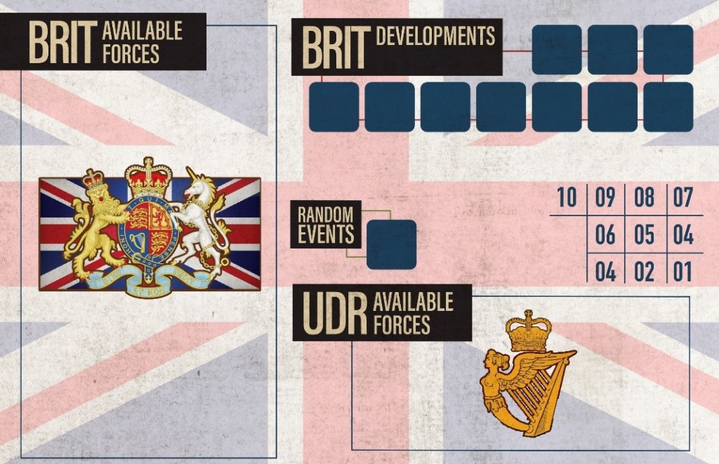 With no associated cost, the British Forces player has unlimited Resources but begins the story with a small deployment. The Unionist Government may Call for Troops, but there is a danger of inflaming Dublin, reducing Anglo-Irish Relations, and surrendering political autonomy through the imposition of Direct Rule. It is difficult but not inconceivable that the paramilitaries may reduce the BF available for use.