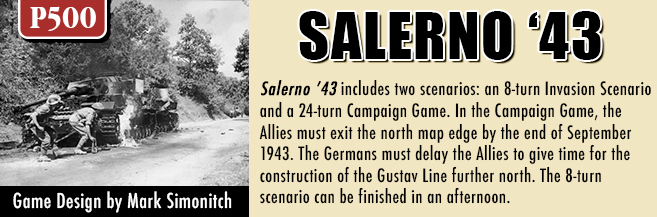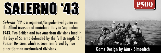 If you are interested in Salerno ’43, you can pre-order a copy for $28.00 on the P500 game page on the GMT Games website at the following link: https://www.gmtgames.com/p-868-salerno-43.aspx