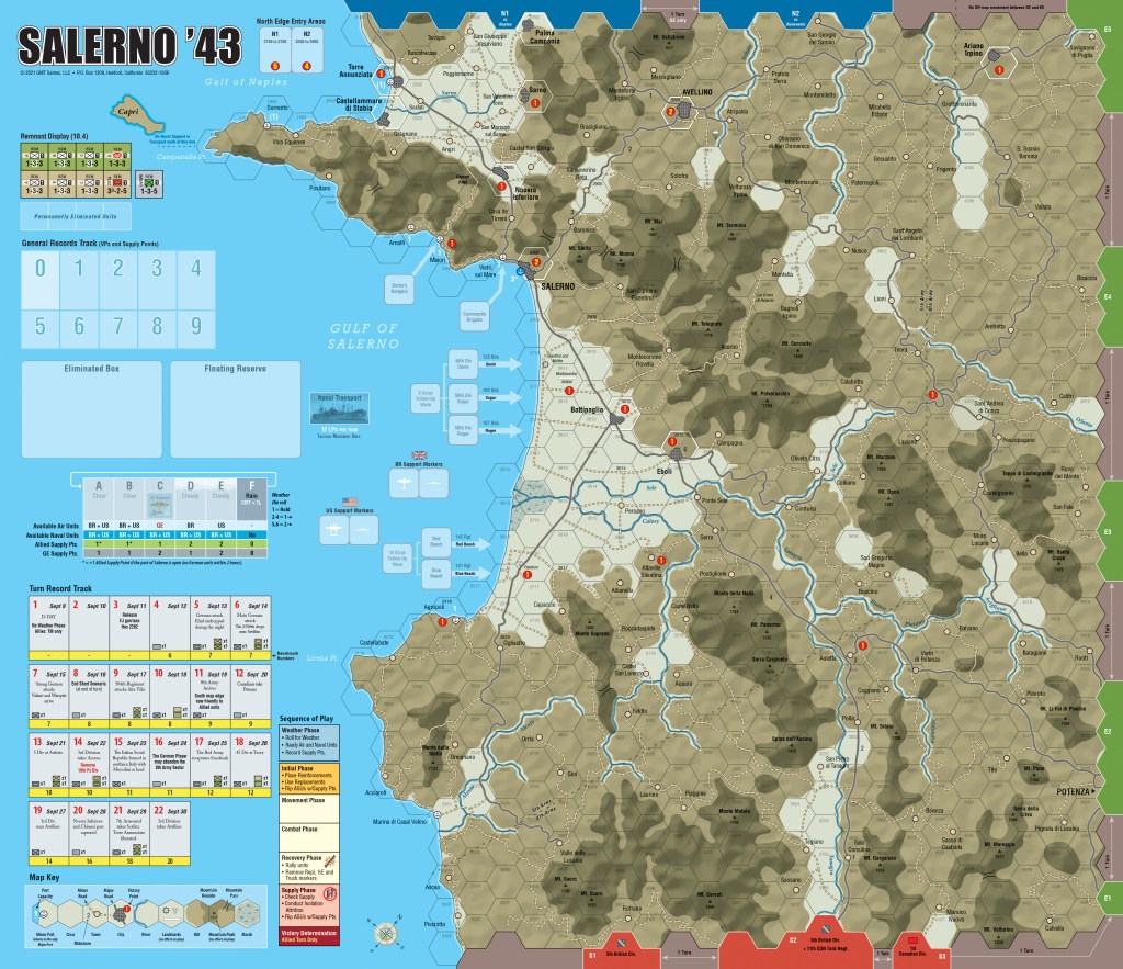 Mark: Salerno ’43 is about the Allied landing in Salerno Bay in September 1943 and the 3-week battle afterwards. The interesting thing about this game is it uses the exact same map scale and unit scale as used in Normandy ’44. I did this so I could compare the two landings in a graphic and spatial way. When you see them side-by-side you can really appreciate how big the Normandy invasion was. They landed with four divisions at Salerno and eight at Normandy.