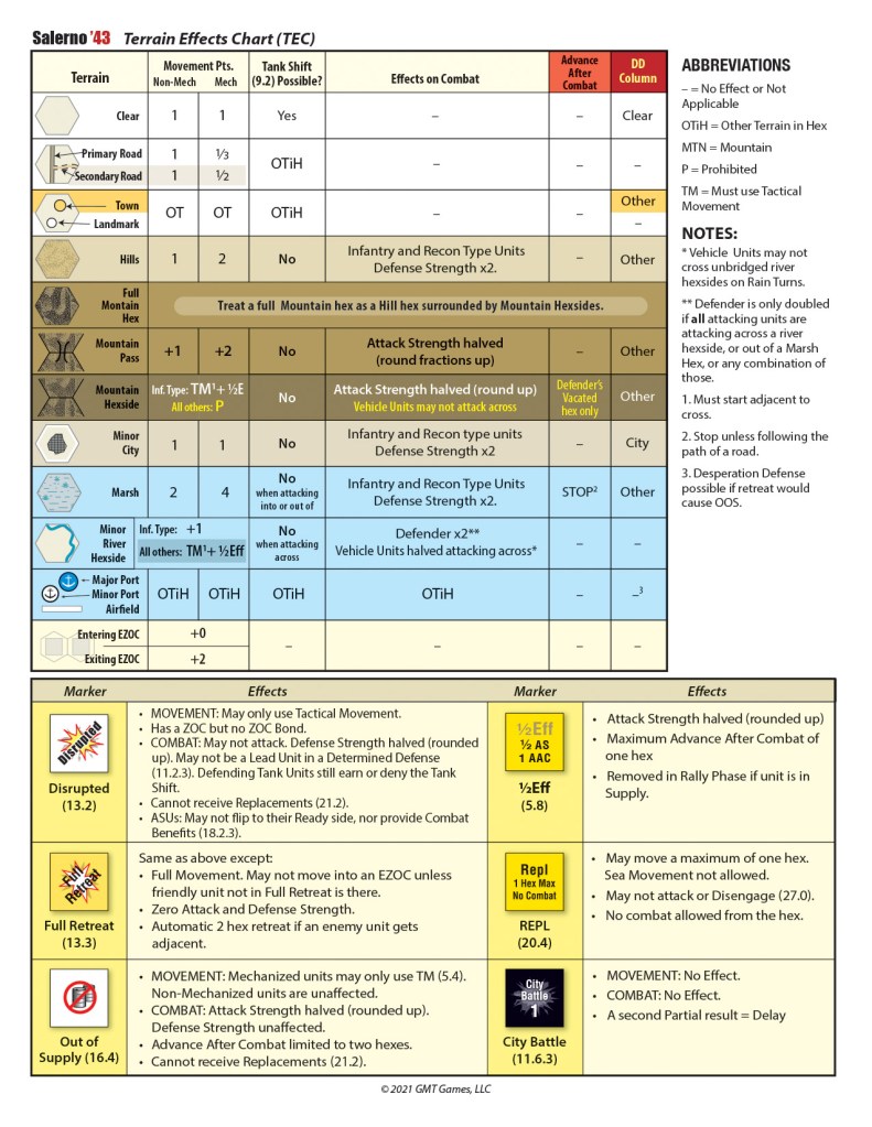 Mark: Yes. Here is the other Player Aid that we haven’t shown yet which includes the Terrain Effects Chart, which shows all the different terrain on the map and how it effects both movement and combat. I have always tried to make the Player Aids as useful as possible as they can speed along the game as they provide all the important information needed by both players.
