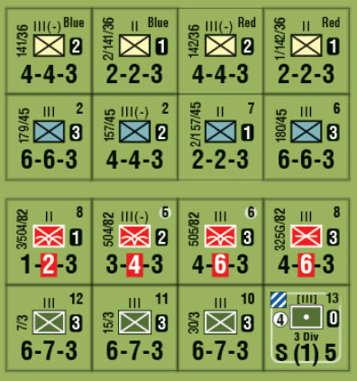 Mark: Units are halved attacking across a Mountain hexside. In addition, any unit that moves or attacks across a non-road/non-pass Mountain hexside is Disrupted and can’t recover until it is back in supply. It represents them crossing but with with very little equipment. In later games in the system I’ll have mule counters so players can bring supply across a mountain hexside.