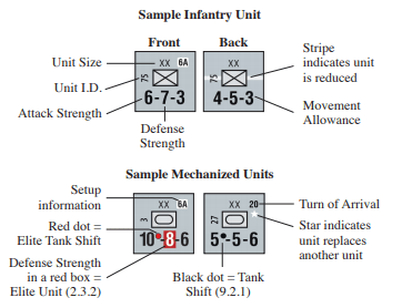 Mark: Here is a look at a Sample Infantry Unit from the rulebook for Stalingrad ’42. Salerno ’43 uses the same layout for counters and the Attack, Defense and Movement values are in the same locations.
