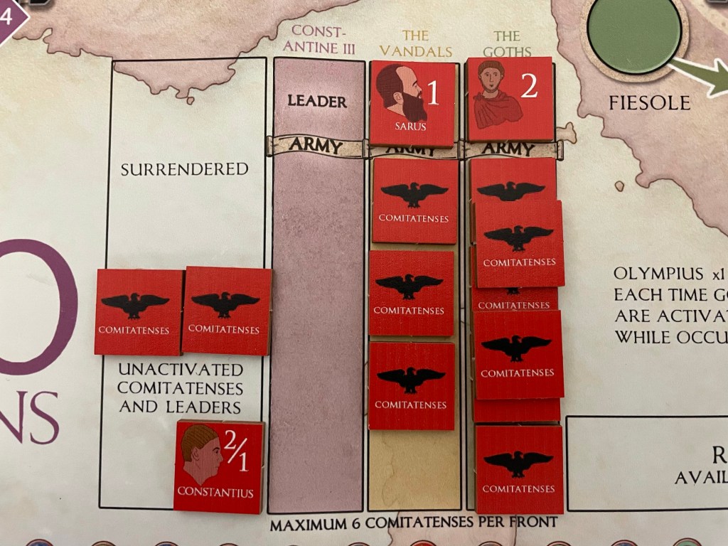 Not very kind it seems as the Romans roll a lowly 1, which will lead to Olympius moving up the Olympius Track as he shares the dreadful news of a weak attack in the field, but we are in luck as The Goths roll just a 1 as well, which will have the further added result of Demoralizing them and flipping their counter to their weaker 4 side. But that will come after this attack is resolved. This means that the Total Attack Value for both sides is an 8 (The Goths had an Attack Value of 7 + 1 Die = 8 while the Romans had an Attack Value of 7 + 1 Die = 8). This means that the battle is a tie! What happens when a tie results? Well, both sides will reroll. But, wait, the Romans decide that they have invested an Event Card into this battle and don’t want to lose, further weakening their army as they will lose a Comitatenses to the Recovery Box.