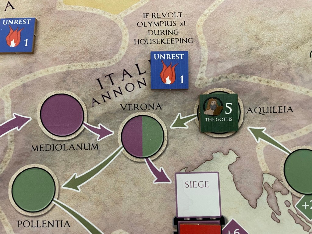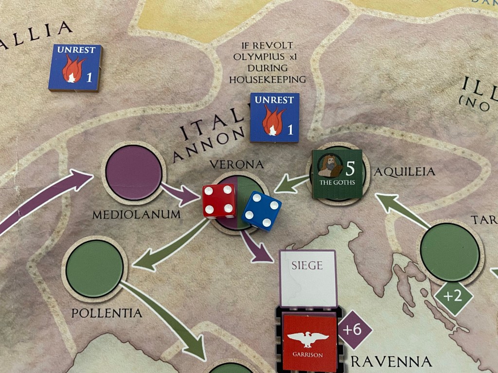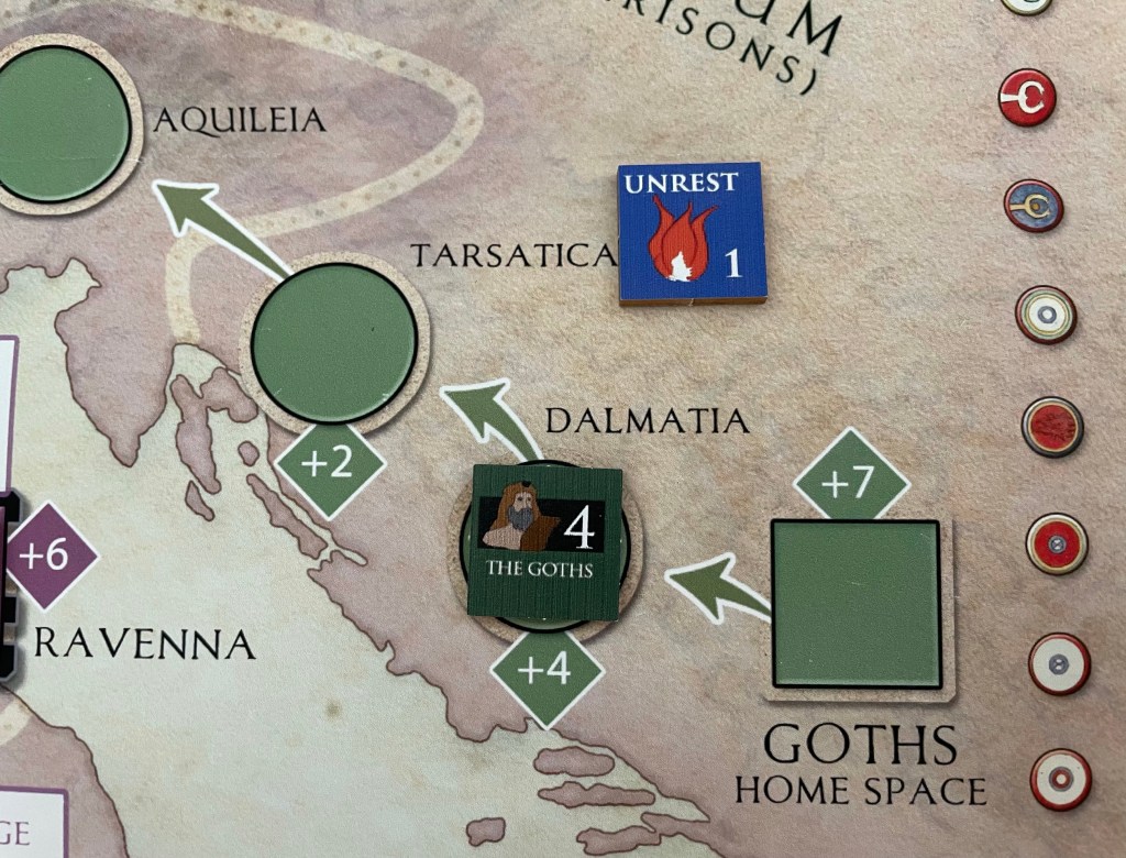 Next, let’s take a look at the situation in Italia Annonaria. The Goths occupy Aquileia and have a base Attack Value of 5, which is printed on the right side of the counter. This Attack Value is further modified by any Terrain Bonuses that the space provides as well as the Unrest/Revolt Value of the Diocese where the attack is taking place. We are fortunate in this case, as there is no Terrain Bonus and the Unrest/Revolt Value of the Diocese is just 1 as denoted by the Unrest counter shown in the space. This means that the Attack Value of The Goths is 6 (5 for printed Attack Value on counter + +1 for the 1 value Unrest counter in Italia Annonaria = 6).
