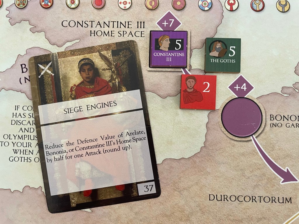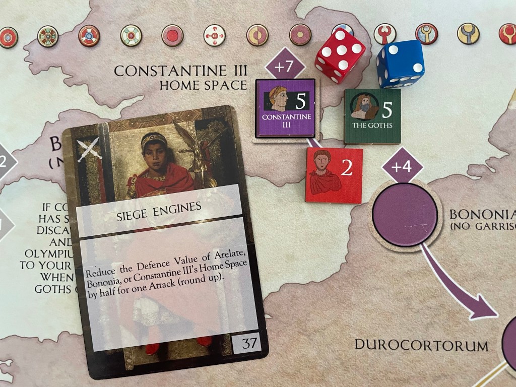 Constantine III occupies his Home Space in Britannia and has a base Attack Value of 5 as he has been previously Demoralized, which is further modified by the +7 Terrain Bonus that the space provides. This means that the Attack Value of Constantine is 12 (5 for printed Attack Value on counter + +7 for the Terrain Bonus = 12). Compare this to Stilicho’s army Attack Value of 11 (5 for the Comitatenses + 2 for Stilicho’s Attack Value + +4 for The Goths = 11). But never fear as the Romans have some tricks up their sleeves in the form of a few cards. The one card that they decide to play before the battle is called Siege Engines and this is a very powerful card that will halve the Defense Value of Constantine III’s Home Space by half rounded up so it gets reduced to a 4. This means that Constantine now has an Attack Value of 9. That is better but there is still some work to do.