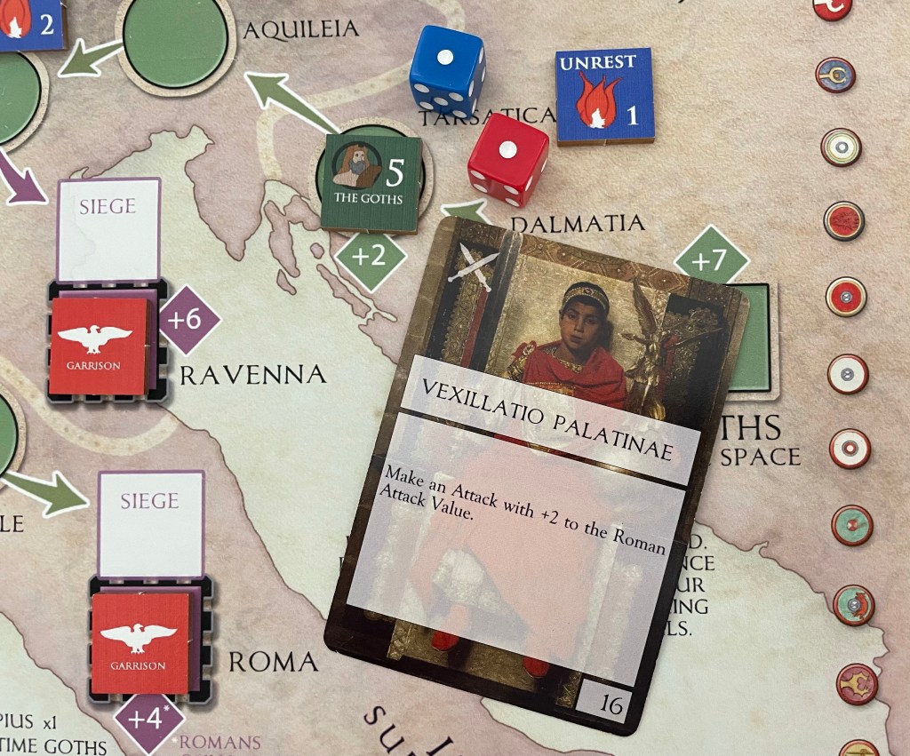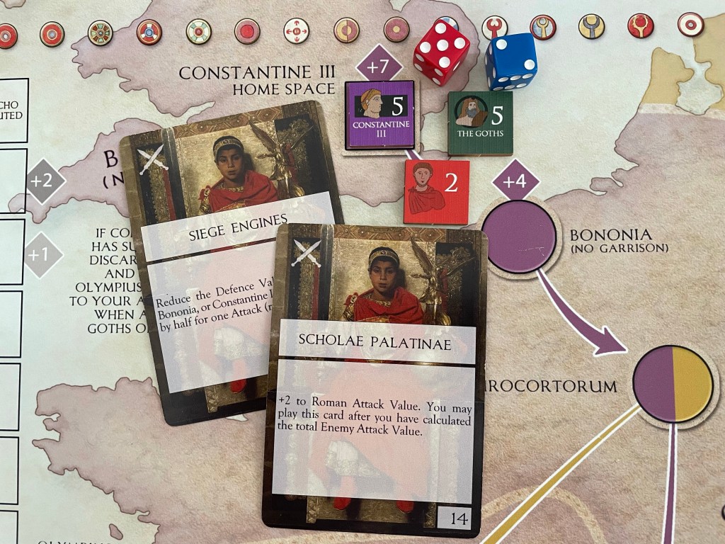 But that one card is a good one named Scholae Palatinae. It allows the card to be played after the Total Enemy Attack Value is determined to add a +2 to the Roman Attack Value. So in this case, after the result is determined to be just one less than Constantine III’s, playing this card will give the Romans a +2 modifier making their Total Attack Value a 15 rather than a 13 which means that they have put down the pretender Constantine III and are one step closer to winning the game.