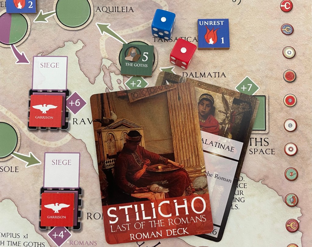 I have taken somewhat of a break from writing these little Action Points over the past 6 months but wanted to get back to them as I really enjoy writing them and sharing my thoughts on the game. A few years ago, I discovered a great solitaire game called The Wars of Marcus Aurelius from Hollandspiele that dealt with the Romans attempting to pacify Barbarian hordes from the north in the Danube provinces during the Marcomannic Wars in 170-180 AD. Now the designer has taken that system and applied it to another period in Roman history when the Goths and Vandals, as well as a pretender named Constantine, were assaulting Rome itself and one man was asked to defend her from her enemies. Flavius Stilicho was a high-ranking general who rose from humble beginnings to become one of the most powerful men in the Western Roman Empire. After many years of victories against a number of enemies, both barbarian and Roman, a series of political and military disasters finally allowed his enemies in the court of Honorius to remove him from power, culminating in his arrest and subsequent execution in 408. In Stilicho: Last of the Romans the player must survive these attacks from enemies both external and internal and quell all three advancing enemies.