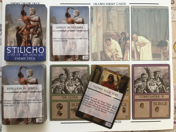 Olympius can really be the source of a lot of trouble as if he reaches the end of his track you will lose your head resulting in an automatic loss. You simply cannot let this one get out of hand and have to watch it at all times. The main reason for this is that his movement is really out of your hands and is based on bad luck. Olympius will be moved from you rolling a 1 on an Attack led by Stilicho, from Enemy Event Cards and from certain Surge Effects. I have found that bad luck will come in waves and if you wait too long to address this it might be too late. You simply cannot let this get out of control and I feel that you must address the Olympius Track before the Difficulty Values on the track increase to above +1. Don’t wait and be proactive and you will control Olympius but remember using your cards for this action will take away from your other goals so it is always a balance and sometimes is a touch choice. But, that is one of the things that make this game great…choices!