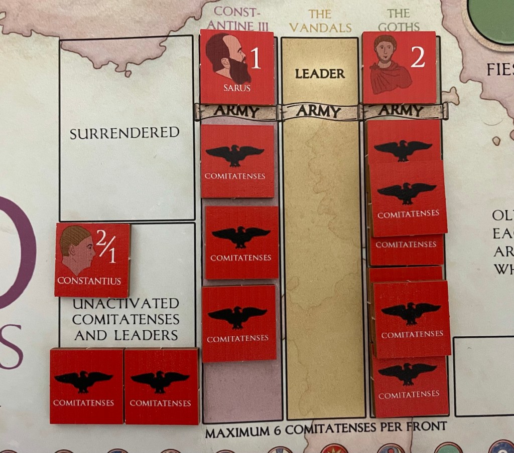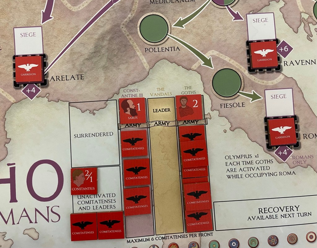 One of the most important assets available to players, other than the cards, are their activated Comitatenses. These are your soldiers used to fight back the advancing Barbarians and having the right amount to do the job is key and you have to focus on getting more to available any chance that you have. At setup, the player will start with 12 Comitatenses along with 2 Leaders that they can distribute between the Army Boxes or place as Garrisons in the three key cities of Arelate, Roma and Ravenna. Because you only have 2 Leaders to start, including Sarus and Stilicho, and because you cannot place Comitatenses in an Army Box without a Leader, you must place them between 2 Army Boxes. You also have a limit of 6 Comitatenses in any one Army Box so you cannot over stack and make a super army.