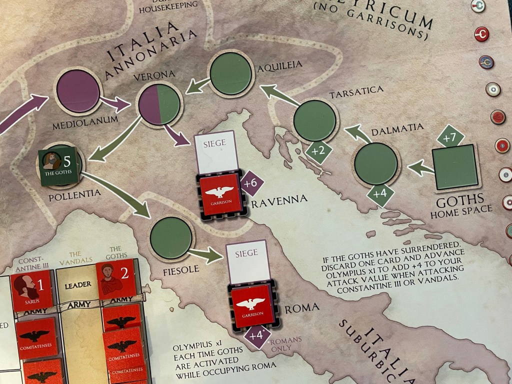 So in summary, go after the Goths, get them subjugated where you can use them against Constantine III and then go directly for Constantine III as he can end the game with a run of activations. The Vandals should be managed and saved to defeat at the end when both other enemies are subjguated.