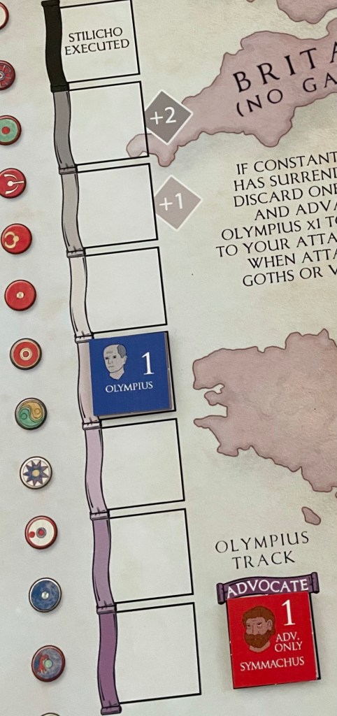 The sneak Olympius can be just as devestating an enemy as Constantine III, the Goths or the Vandals. And as such, you must pay attention to where he is. The Olympius Track, which represents the devious Olympius’s attempts to undermine Stilicho in the Imperial Court of Emperor Honorius, is the source of many a headache and caused me to lose this game far more often than any of the attacking Barbarians. Olympius can be moved up and down the track through the play of cards, both negatively and positively. Enemy Cards will always move him up the Track toward the untimely execution of Stilicho while the play of Roman Cards will keep Olympius in check and move him downward. An Advocate Box is located to the right of the Track and holds a Leader named Symmachus who is assigned to oppose these machinations.