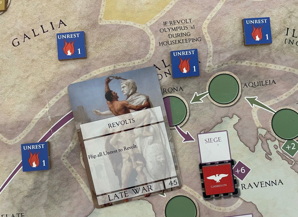 There are some events that are just too important to your efforts to ever discard to take an action as they provide you with such great benefit and are more efficient than taking individual actions. Don’t get me wrong though the playability of a card is always dependent on when in the course of the game the card is drawn. An example of what I am talking about is the Militia Roman Card. This card allows for the player to simply remove two Unrest or Revolt Counters from the board. No roll needed. This is a huge benefit as you normally have to discard a card to take the action and also then roll a d6 and roll higher than the value printed on the counter, higher than 1 for an Unrest Counter and higher than a 2 for a Revolt Counter. You must think about these cards as value actions as you get better results for less of a resource commitment.