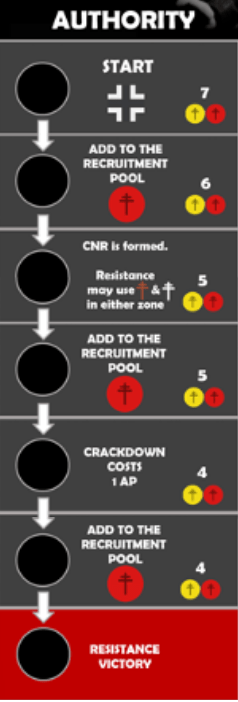 Dan: Authority marks the minimum number of Resistance pieces required on the map for a Resistance victory and the minimum Occupation Resources required for an Occupation victory. As the game progresses, the Resistance will perform Sabotage actions that can reduce the Occupation’s authority (as marked on the track).