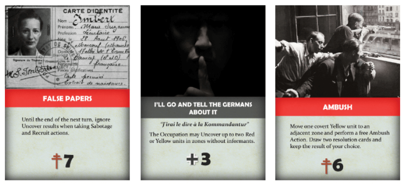 Chris: In many articles on the subject, there is a mistaken belief that there was one monolithic “French resistance”, when in fact there were a number of very different groups fighting the German and Vichy occupiers. The Suits (described below) in the game represent the lack of coordinated operations between various resistance groups, but they represent challenges the Occupation faced in ferreting out local Resistance groups in various locales without support of milice and informants.