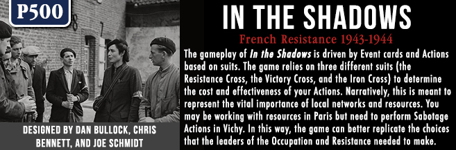 If you are interested in In the Shadows: French Resistance 1943-1944 you can pre-order a copy for $30.00 from the P500 game page on the GMT Games website at the following link: https://www.gmtgames.com/p-905-in-the-shadows.aspx