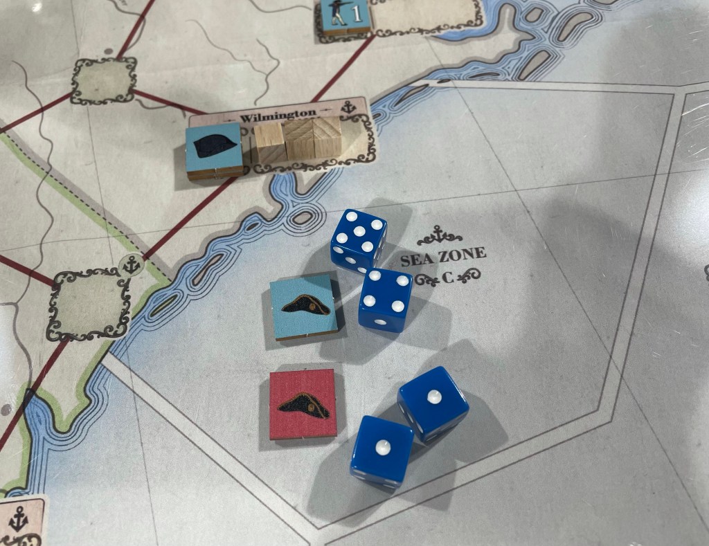 These numbered counters represent your soldiers and come in denominations of 1, 2, 3 or 4. At any time, players can make change with these soldiers to split them and move to different areas after activating that stack. A single soldier or stack of soldiers in the same space is referred to as an Army and has no stacking limit. Due to the nature of the fighting in the Southern Colonies, there are not a great supply of soldiers for either side. The South didn’t have the major population centers like the Northern Colonies did in cities such as Boston, New York and Philadelphia and was more rural and agrarian in nature. Therefore, the British didn’t focus at first on the South as they were chasing Washington and his small army around the north trying desperately to corner him and force a deciding engagement in the form the British were familiar with and really designed for. Because of this different character and makeup of the South, neither side has a glut of Units on the board at any given time. The Crown forces were engaged in their chase in the North and only released a few troops to act as custodians and enforcers in the South to try and raise the local population in support of their efforts as there was a misconception that the South was more loyal to the crown than they actually were. Because of this, the Crown starts with only 8 Units located with a Leader in Savannah and their lone Navy located in the Sea Zone near Charleston, South Carolina. The Patriots start with just 2 Units stacked in Charleston and really have very little hope of holding out or causing any real issues for the Crown forces.