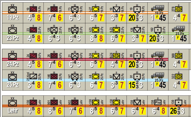 Chip: The counters are standard OCS design. Some of the special ones include Hans-Ulrich Rudel’s tank-buster unit, Hartman’s JG 52 elite fighter unit, some Soviet tank units equipped with Lend-Lease tanks, and some of the heavier tanks then being fielded. We had quite a debate over how to represent Tiger tanks, which were usually committed to battle in Company-sized formations. Soviet JS2 tanks tended to show up in Brigade strength, so that is how we represented them. We also worked with several other OCS designers to create a common way of representing Soviet SU vehicles. An SU-76 in an infantry support role was very different from an SU-85 tank destroyer or the SU-122/152 assault guns.