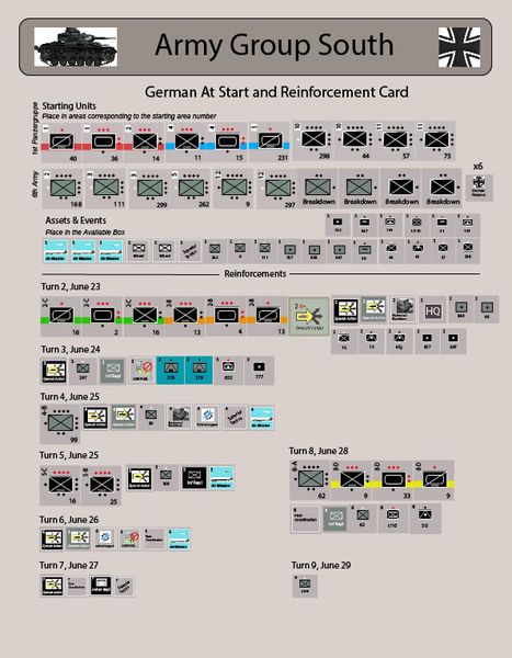 Francisco: In FAB units (blocks) are usually divisions and Higher Echelons (Armies) are depicted. So, German units are part of Army Group South’s 6th Army and 1st Panzer Group. 6th Army infantry divisions were attached to both Mobile Korps from 1st Panzer Group (III & XLVIII) that took part in the battle, so in the game they appear as part of the panzer force. A total of 12 infantry divisions, 2 motorized and 5 panzer. Soviets also fielded two combined arms armies (5th & 6th) plus a General Reserve that can be added to any army. Mechanized Corps were organic to each Army and also others from the General Reserve were added for the planned big counterthrust, so I included them as part of the Armies to which they were attached.