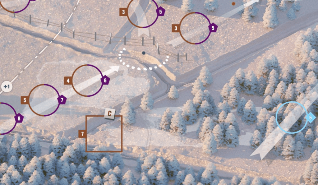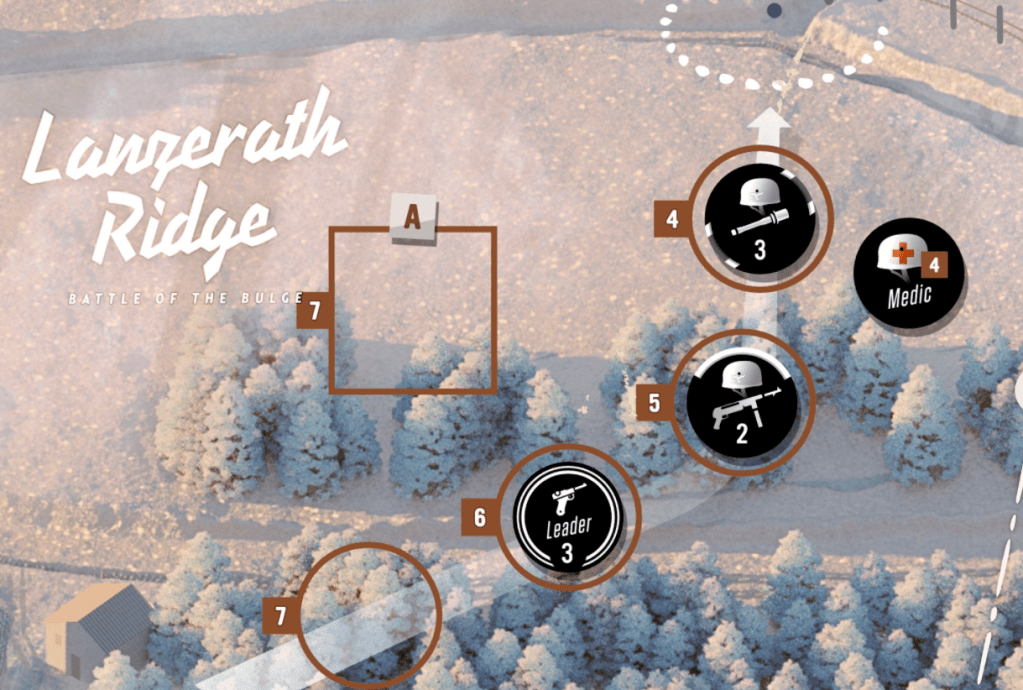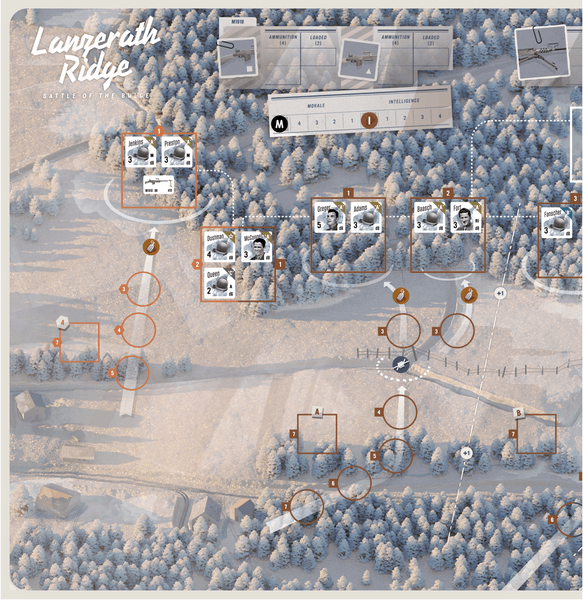 David: These both represent critical parts of the actual battle. Lt. Bouck, the leader of the American defense, had to decide throughout the day whether to continue to hold or withdraw his platoon. Morale remained high throughout the day, despite casualties. But had more of the defenders been injured or killed, their morale likely would have broken, leading them to abandon their position early. In addition to their defensive stand, the platoon was tasked with reporting the Germans’ position and actions. The intelligence track reflects those actions.