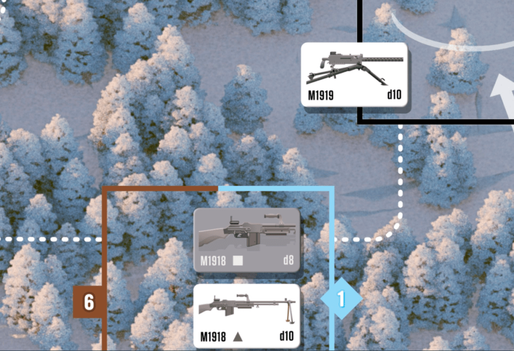 David: For the first time in a Valiant Defense Series game, weapons use different dice types to represent effective range. Short-range weapons, such as Bouck and Sharpe’s carbines, have the lowest dice type (d6), while the M2 machine gun has the highest dice type (d12). This allows the game to elegantly model the upper limit of effective weapon range. Weapon efficacy is separately modeled by the use of multiple dice, through a combination of the the Inspire attribute and Adjust Fire action (Bouck and Sharpe’s carbines also use 2d6 for their combat values, representing the effectiveness of the semi-automatic weapons at close range). Machine guns can be dismounted and moved during the defense, albeit at the cost of reduced effective weapon range. Extensive use of the machine guns can lead to overheating, reflecting what actually happened to the M1919. Machine gun ammunition must be managed, and for optimal use defenders should be dedicated to reloading them.