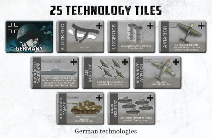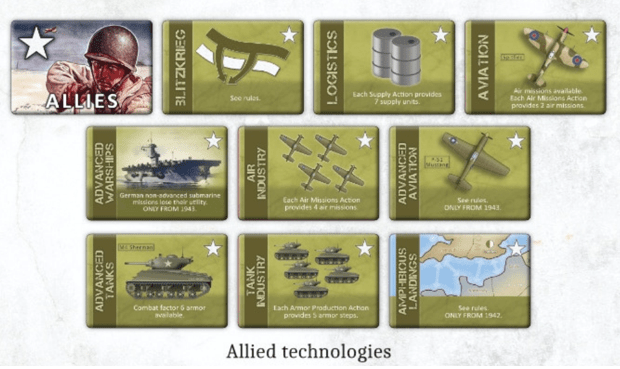 Victor: The production of tanks and air missions are two Actions that acquire special relevance with respect to Downfall of Empires. There are also, as a novelty, the Actions of submarine missions and the Lend Lease. Apart from the Actions, I would also like to mention that the technologies have also been adapted to the conflict, in this way we will have, among others, the technologies of: Amphibious Landing, Advanced Tanks, Advanced Aircraft, Blitzkrieg, Logistics, etc.