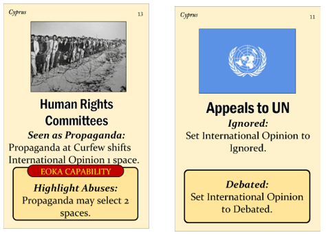 Cyprus: Cyprus is the latest conflict in the pack, starting in 1954. A major theme of the game is the rising international pressure for human rights. The international dimension put significant pressure on the British and affected their decision making about tactics. Cypriot lawyers tried to raise cases of human rights abuses, and the Greek Government consistently raised the issue of Cyprus at the United Nations.