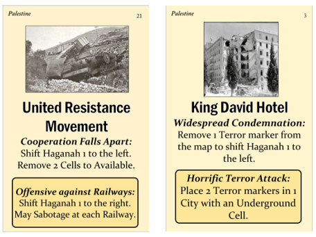 Palestine: A central theme of Palestine is the role played by the larger more moderate resistance organization, Haganah, during the Jewish insurgency. Haganah begins the game allied to Irgun (the player faction) as part of the United Resistance Movement after WWII, but historically ultimately broke with Irgun over their use of brutal terror attacks that resulted in high civilian casualties, as occurred at the King David Hotel Bombing.