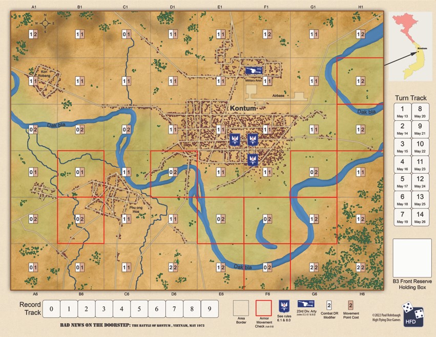 If you are interested in Bad News on the Doorstep: The Battle of Kontum Vietnam, May 1971 you can order a copy for $17.95 from the High Flying Dice Games website at the following link: http://www.hfdgames.com/kontum.html