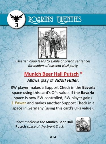 Playing the card, next to allowing the play of Adolf Hitler, also gives the RW player a Support Check in Bavaria, and potential to gain Power and another Support Check anywhere in Germany.