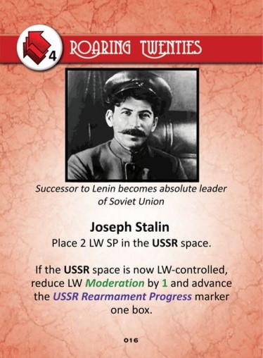 When played for the card’s printed event, the Joseph Stalin card will place Left Wing (LW) Support (SP) in the USSR space. If that space is then controlled by the LW player, their Moderation will go down (which is a bad thing – working with the communist Soviet Union at the time isn’t really accepted in Interbellum Europe) but in exchange they get one advance on the USSR rearmament track. So there is a tough choice with the paly of the this card depending on what situation the player finds themselves in at the time.