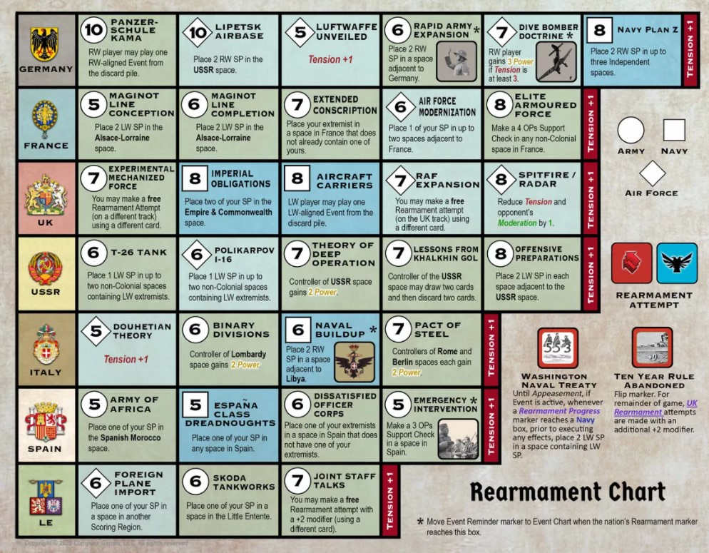 Grant: What has replaced the Naval Arms Race in the game? How is it different? What is the purpose of the 7 different Rearmament Tracks on the board?