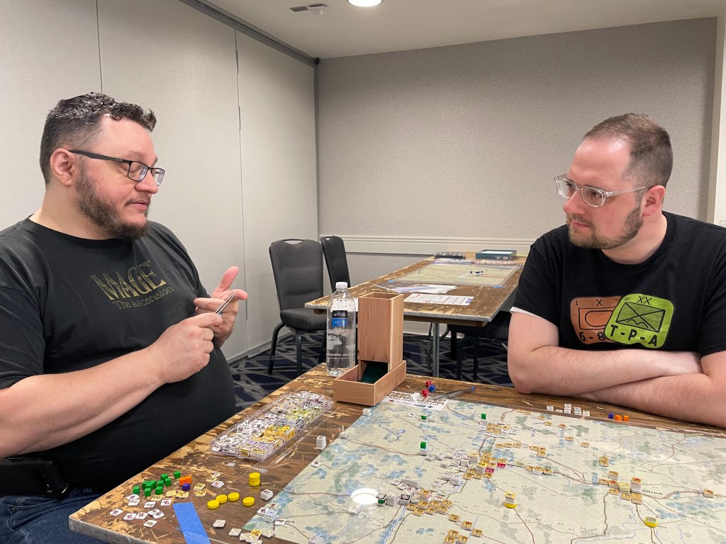 Speaking of teaching opportunities. One of the highlights of our time was our 3 hour session with Gary Mengle of Ardwulf’s Lair fame who sat down and gave us a crash course in the glorious system that is the Operational Combat Series from Multi-Man Publishing. Gary is an expert at the series and has played many of the volumes but at BGF he had an introductory volume in the series called Smolensk setup and was playing a game with a friend, but also using it as a chance to convert some new OCS disciples. He basically took us through the entire 3rd turn for the Germans as they moved against the Soviet stacks defending their cities during Operation Barbarossa during the summer of 1941.