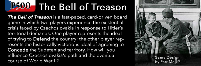 Petr: “The Bell of Treason” is a verse from Fratišek Halas’ poem, which was written very soon after the Munich Conference. The full verse is “There tolls the bell of treason, the bell of treason. Whose hands have swung its rope? Sweet France, proud Albion. The very ones we loved.” You see it is a cry over western democracies giving up on new democracy in Central Europe and abandoning their treaties (in the case of France). I am trying to emphasize that this is a Czechoslovak point of view on the crisis with this title. The game shows that this cry of the betrayed could not be the cry at all. It was Czechoslovakia’s final decision to concede the Sudetenland under pressure, not the decision of a conference and powers putting the pressure. Czechoslovakia could instead have chosen to defend against Germany. The game is about that decision: one player is called “Concede” and the other “Defend”.