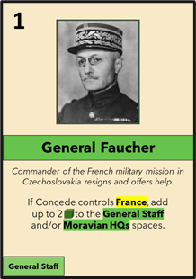 Th General Faucher Card shows one of the individual effects of the appeasement policy. You can see this card effect applies only when the Concede player controls France. If France says that they will fight the card then has no effect. But once she turns around and wants Czechoslovakia not to fight, this man steps in to support the Defend cause.
