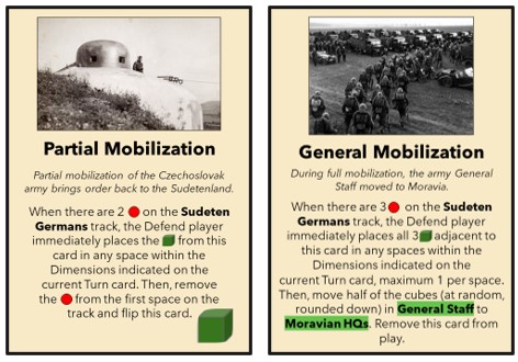 Petr: The Czechoslovak decision to defend was the second most probable outcome of the crisis. That is why it is in the center of the game. The other possibility was a different outcome of Neville Chamberlain’s politics in the United Kingdom and France. It is less probable, but the game even shows a little bit of this, with the possibility of Defend controlling those spaces. Overall I am trying to show the impact of the appeasement policy on an initially defense-determined small country facing pressure from an aggressor.