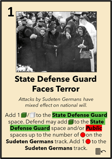 Petr: This State Defense Guard Faces Terror Card shows the effect of the growing intensity and scale of Sudeten German terror attacks in Sudetenland. While they have a mixed impact on the State Defense Guard, which were often lone gendarmes or finance guards in a now hostile environment, they can also cause a mobilization of the general public against the terror. More and more attacks will have a larger and larger impact, as the number of green cubes placed depends on the progression of the Sudeten German (Terror) Track.