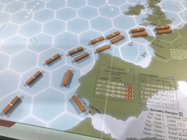 That is where this new system in Atlantic Chase does such an admirable job, in creating and maintaining that elusive Fog of War concept that we all love so much as wargamers. I hate having the “God’s Eye” view of all the units on the board during a wargame as well as generally knowing their strengths and makeup. I want to be surprised, and unsure about the makeup of my enemy, as it creates some fantastic tension and palpable hesitation about making attacks, you know, the way that we all have imagined that it actually is on the battlefield! How does it do this? Actually, very simply. The game utilizes a system of trajectories of ships using nothing more than small different colored matchstick style wooden bits with various markings on them to represent which taskforce they belong to. These trajectories are laid out on the hex board in the shortest path from port to port and represent the path of travel that the ships will take. Like I mentioned earlier about the Admiralty and their pins and strings, players don’t necessarily know where their ships or the enemy ships are located along that trajectory but must perform various actions to move along it and also try to perform actions such as Naval Searches to pinpoint where the taskforces are on the map.