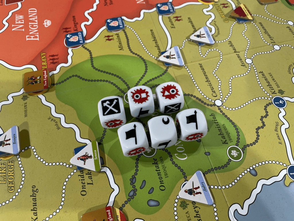 Every time I play one of these French & Indian War games I always try to look for how they represent matters like terrain and movement, seaborne operations, sieges, fortifications, especially for the French and their bastion at Louisbourg, Indian raiding, Indian tribes and their fickle loyalty and Colonial enlistments. If these elements are not modeled into a French & Indian War game, then it really isn’t about that period. This game really does a bang up job of modeling all of these elements. The best part of the design is the use of custom dice that are connected to the symbols for the various units. Remember, Squares for Brigades, Triangles for Light units and now Circles for Artillery/Fleets. There are also a few other symbols, including a crossed bayonet and tomahawk that typically means success on a Raid action or a hit for certain units and a flag which means a morale hit and can lead to forced retreats. Frankly, while the symbology is very easy to understand for the units, the battle system was the biggest challenge that we had with the design. It is not bad, it is just a bit more complex and requires the players to use the player aid and the rulebook for all battles as it is just too difficult to follow and remember, even after a few plays. It works very well and is coupled with a very interesting Battle Track that tracks hits and morale losses and when the battle is over, the victor will be the player with their Battle Track Marker higher than the other player. The loser will have to retreat and this is very important and really creates some tension as the process unfolds. Having to retreat out of a fort that you just built doesn’t feel great but happens sometimes. Don’t worry though, you can scuttle the fort so that your enemy cannot use it against you until they build their own.