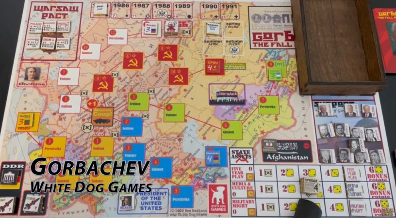Gorbachev: The Fall of Communism is a very interesting States of Siege style solitaire game designed by Ben Madison and published by White Dog Games. The player takes on the role of Soviet leadership by playing as Mikhail Gorbachev in an effort to move Russia toward democracy during the fall of Communism over the period of 1985 to 1991.