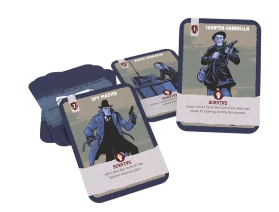 David: You are correct that the game only uses cards. This was intentional to keep the footprint small and make it simpler to play. The game uses five different types of cards: Civilian, Enemy, Maquis, Mission, and Spy.