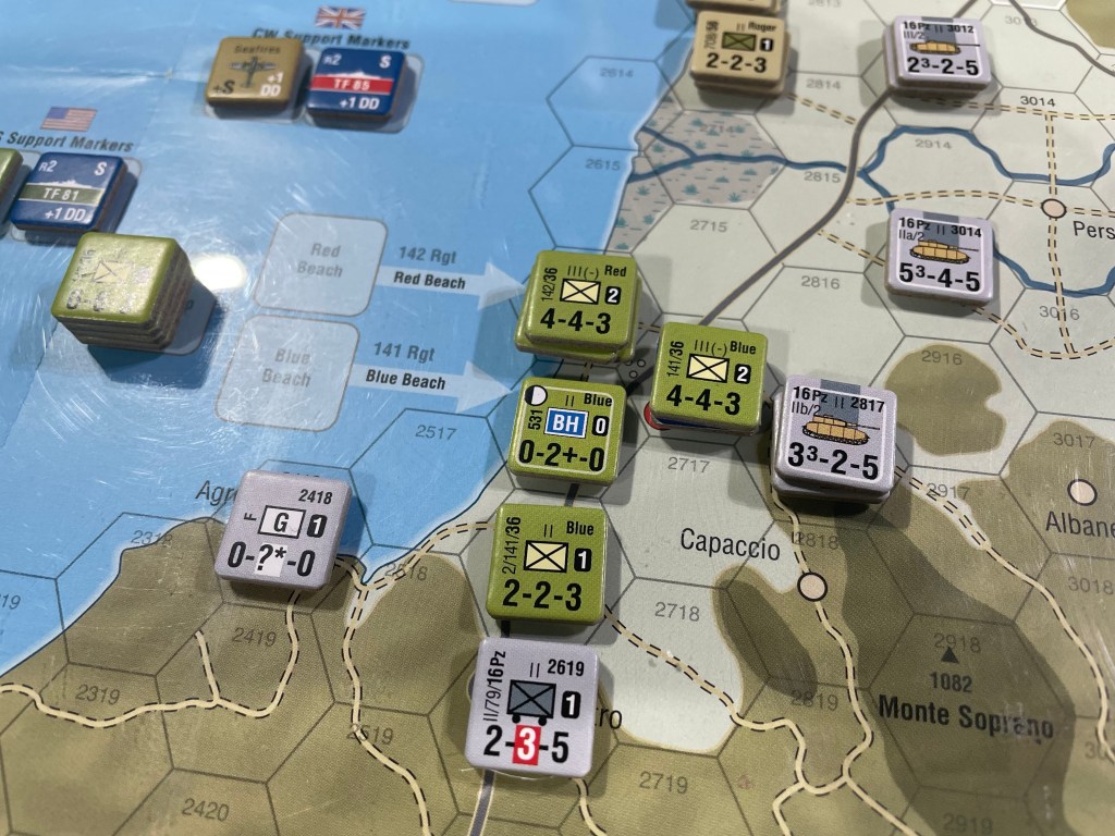 I thought this Invasion CRT was well done. It was quick, only happening on the initial landing phase starting out the game, and simple to adjudicate as you just roll and refer to the appropriate column. I was unlucky with my rolls in the game as most of the Allied landings only advanced 1 hex and I lost a step on Uncle Beach, which was a sore that I had a hard time recovering from initially. But my 2 landings that did go well gave me a head start on securing important Victory Point hexes in Paestum located east of Blue Beach and the Montecorvino Airfield located east of Sugar, or at least putting the pressure on the German defenders, to keep me from those VP hexes.