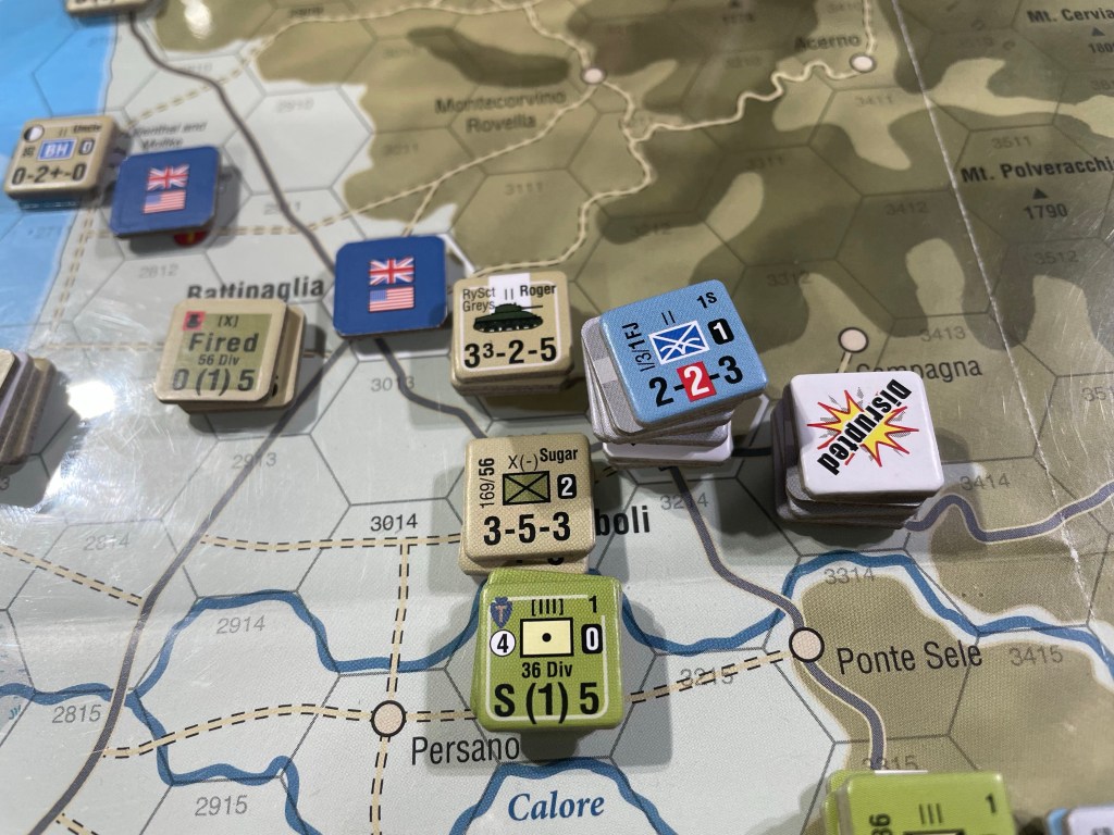 So that was a lot just to say that for our game of the 9-Turn Avalanche scenario, it came down to the final turn and even the final roll as there was a chance that the Germans could have held out. The Allies had moved off the beaches to Eboli, which is a Minor City in the eastern portion of the Salerno Plain. There, the Germans setup the best defense that they could muster and were able to hold that Minor City for the better part of 4 rounds. As you can see in the picture below, the Disrupted counter on top of the stack behind the German stack in Eboli was just hit and hit hard by the Americans outside of Persano. With several column shifts from artillery, and a good roll, the Germans were required to retreat and didn’t have enough units to mount a Determined Defense. This then setup up the final turn where the combined Commonwealth forces of Roger and Sugar were able to carry out a concerted attack with decent odds enough to it such that as long as they didn’t roll a 1 or 2, they would Disrupt the only remaining healthy unit and force a retreat from the 8th and last remaining VP hex that the Allies needed to control to win the scenario. To our delight, this roll even mattering at this point was a major victory for the design and ultimately I rolled a 5 causing the Disruption and retreat. This game is very good and after 4 hours, the combat still mattered…and it was glorious!